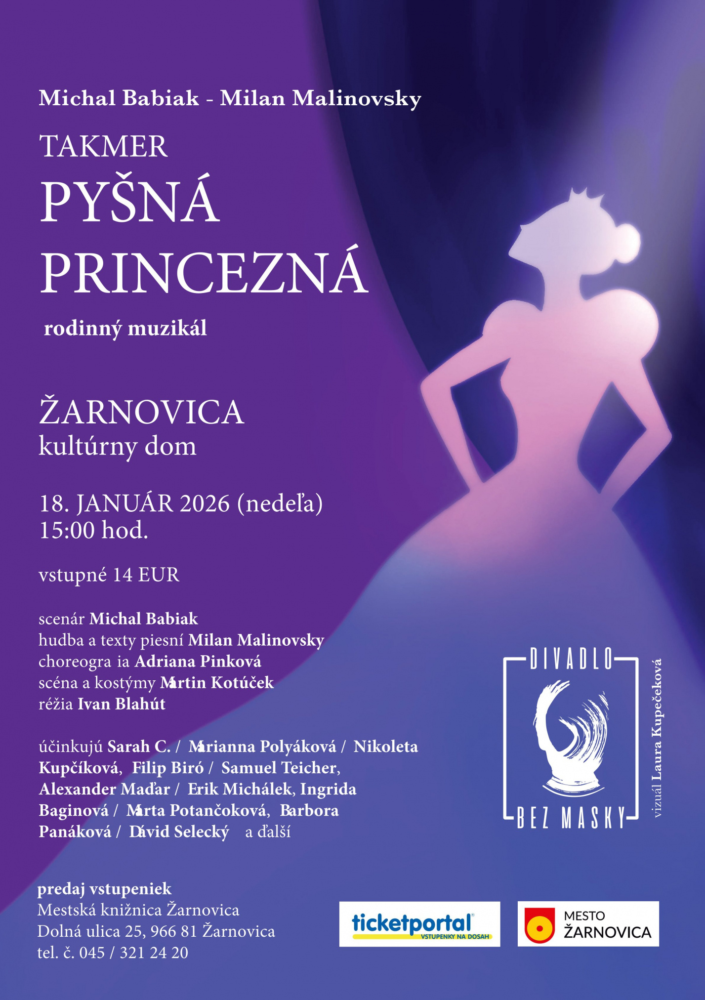 Dňa 18. januára o 15.00 hod. zavíta do Kultúrneho domu v Žarnovici Divadlo bez masky s modernou muzikálovou rozprávkou Takmer pyšná princezná. Ide o nové divadelné spracovanie príbehu, ktorý poznáme aj z legendárneho filmu z roku 1952. Diváci sa môžu tešiť na svieže postavy, nové dejové zvraty, atraktívnu výpravu výtvarníka Martina Kotúčka a chytľavú hudbu skladateľa Milana Malinovského.